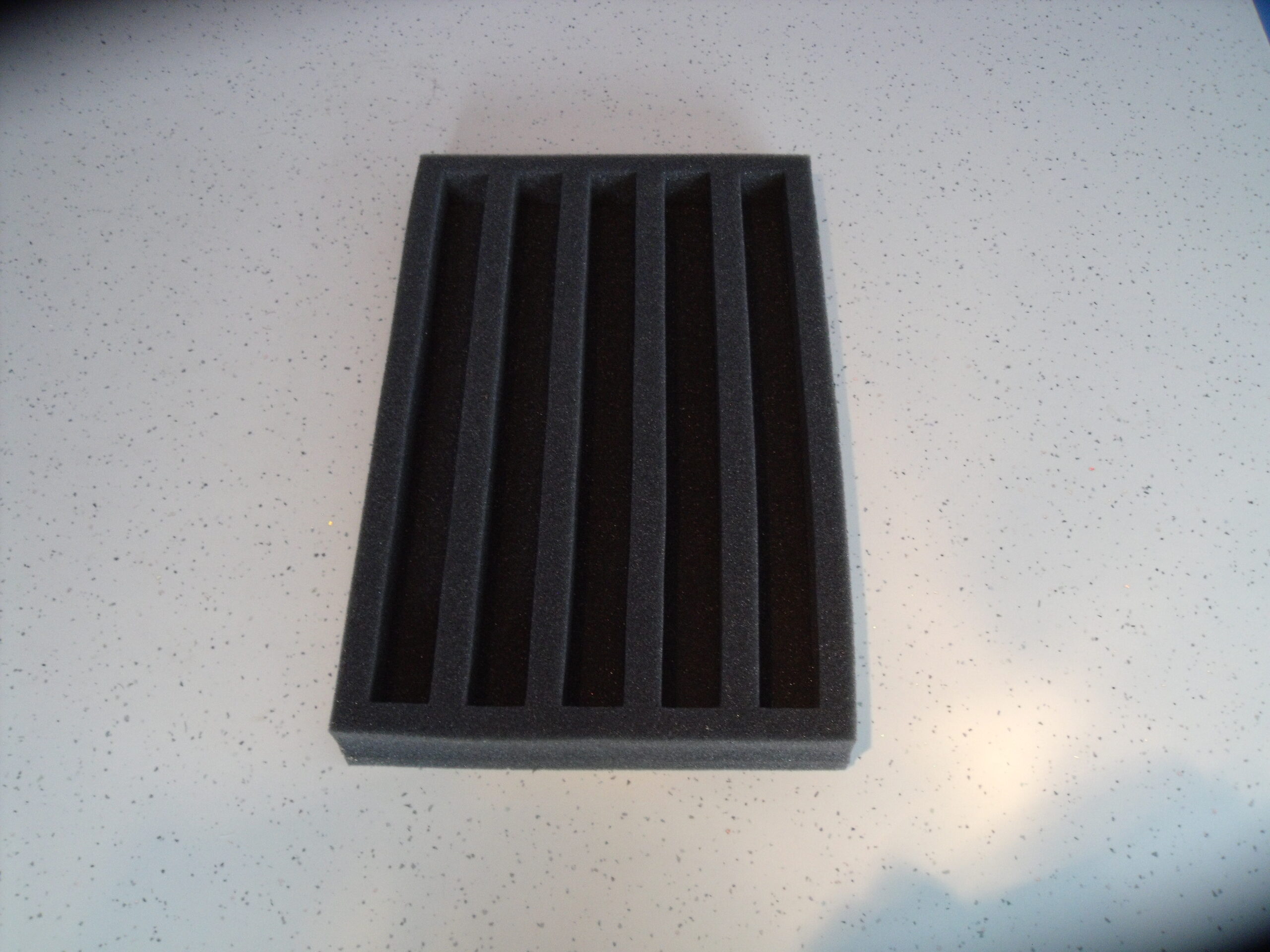 FOAM INSERT PRE CUT WITH 5 LENGTH-WAYS SLOTS TO FIT REALLY USEFUL 4LT BOX. ( TWO REQUIRED PER 4LT BOX ). EACH SLOT 310MM LONG. SLOTS 25 WIDE X 25MM DEEP. ACCOMODATES LONGER N GAUGE COACHES / WAGONS / LOCOS. SUPPLIED WITH COVER SHEET.